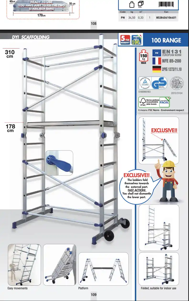 Descoperă schela multifuncțională PINNA de la FACAL Italia, soluția ideală pentru lucrări profesionale de construcții sau amenajări DIY. Construită din aluminiu robust și ușor, schela mobilă PINNA îți oferă stabilitate maximă și versatilitate unică: poate funcționa ca scară dublă, scară de sprijin sau platformă de lucru la înălțime.